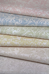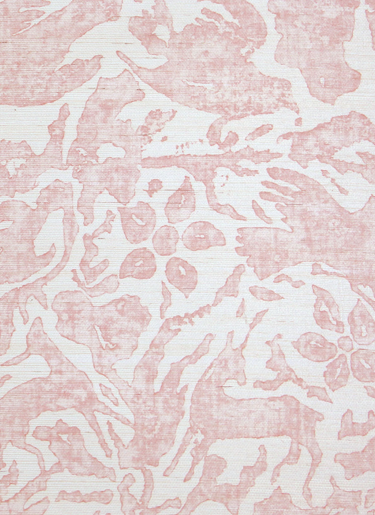 Antelope & Flower is screen printed to echo the character and nuance of a hand block print. A gently abstracted mix of floral and animal motifs brings movement and rhythm, while the natural weave of the grasscloth ground adds texture and depth. Offered in six pastel colorways.